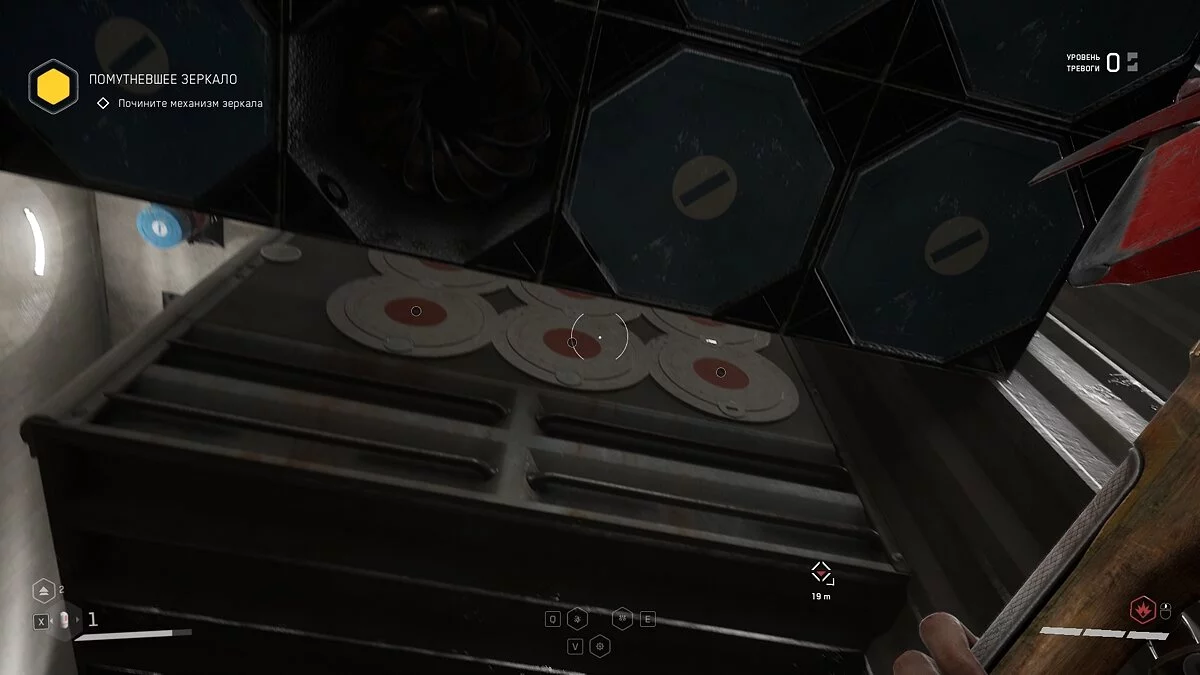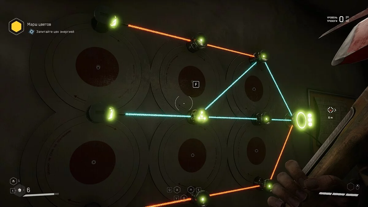 Взаимодействуйте с любым из шести дисков, чтобы появились лучи разных цветов. Вам необходимо сопоставить их так, как указано на скриншоте ниже. На данный момент неизвестно, может ли комбинация меняться у разных игроков.