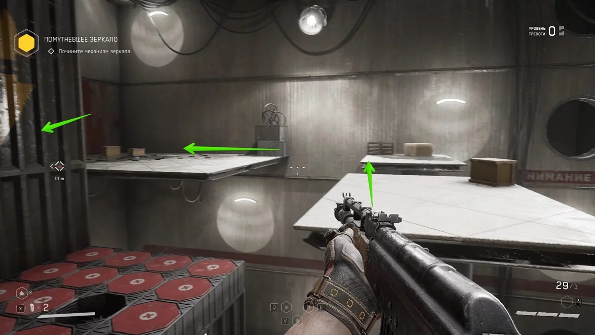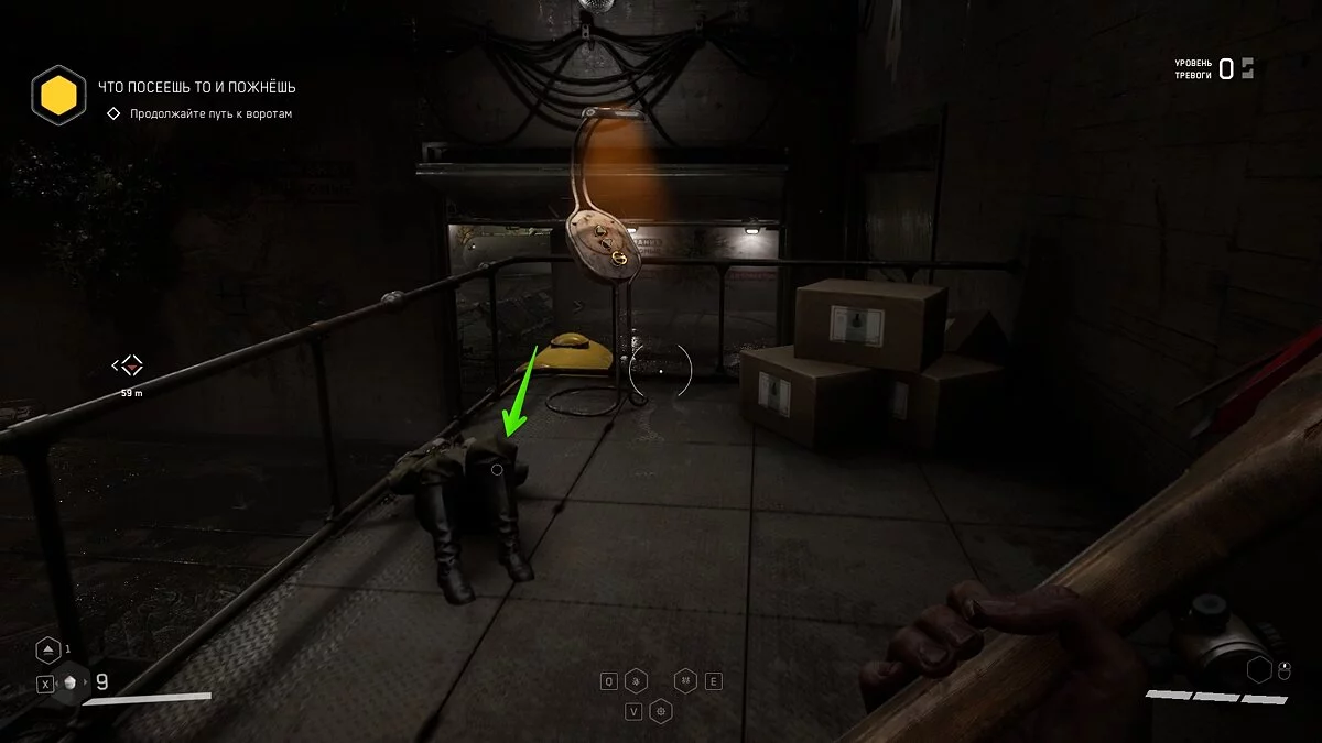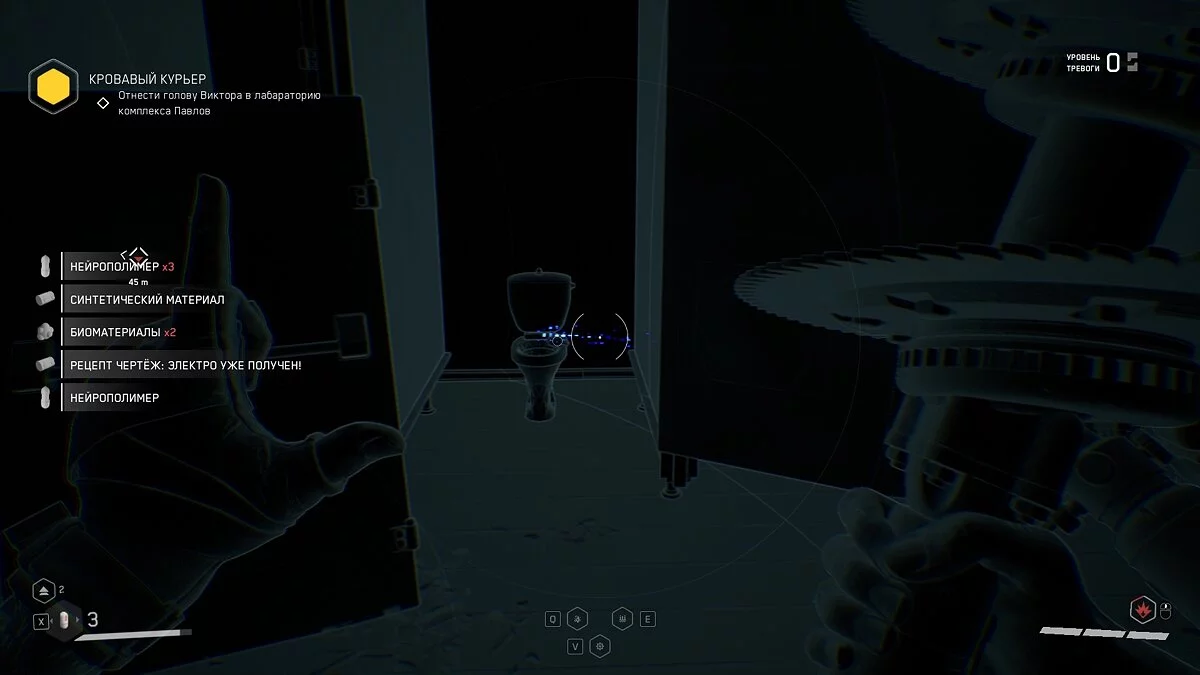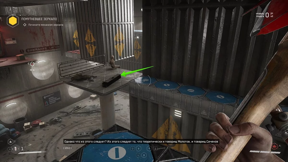 Выбирайтесь из лифта и осмотрите шкафчики с ресурсами. Подобные объекты подсвечиваются сканером синим цветом. По мере прохождения вы будете часто встречать их на своём пути. Используйте шкаф, чтобы пробраться в вентиляционную шахту. Здесь отыщите штурвал и аудиозапись рядом с трупом военного.