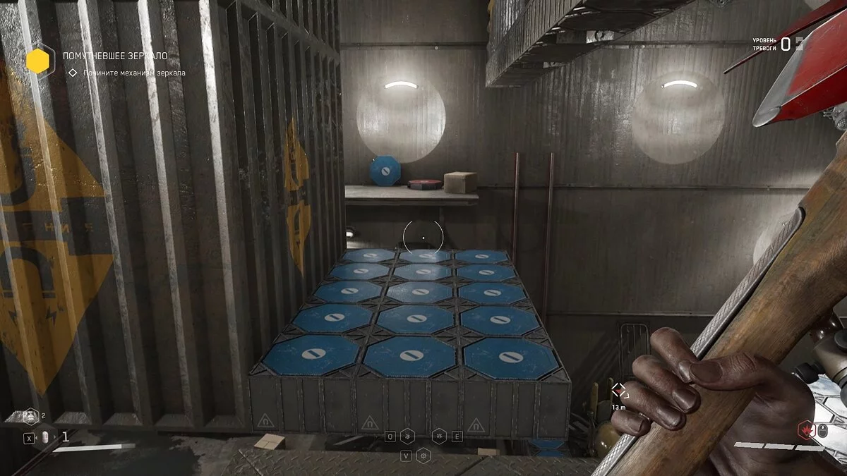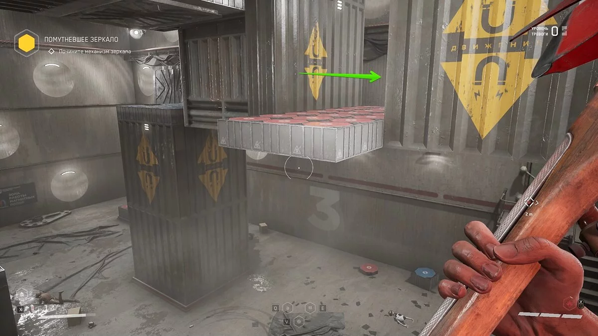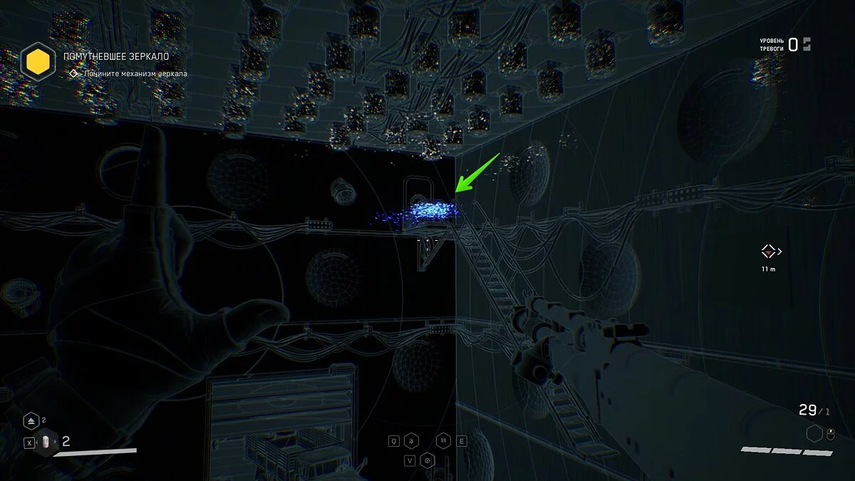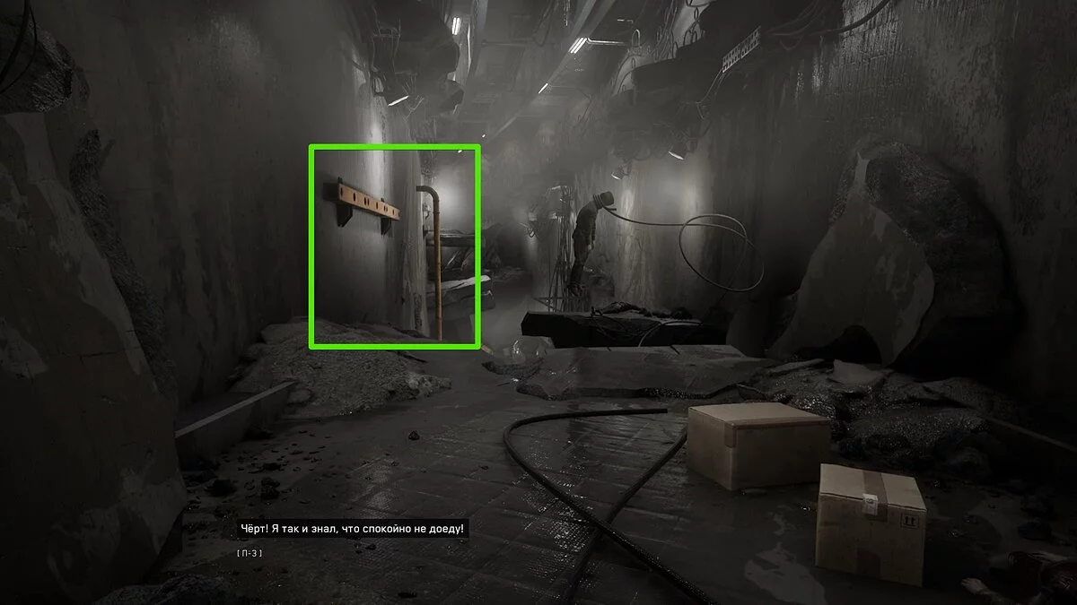Выбирайтесь из лифта и осмотрите шкафчики с ресурсами. Подобные объекты подсвечиваются сканером синим цветом. По мере прохождения вы будете часто встречать их на своём пути. Используйте шкаф, чтобы пробраться в вентиляционную шахту. Здесь отыщите штурвал и аудиозапись рядом с трупом военного.