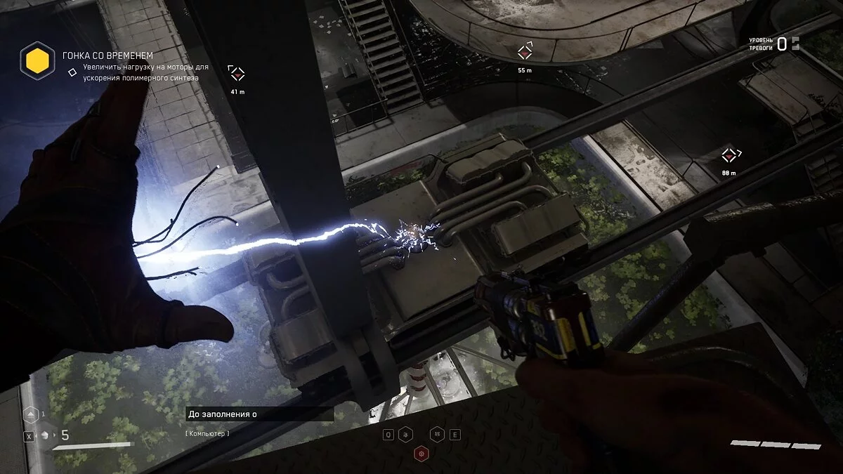 После крушения кабинки вас обучат элементам паркура. Обращайте внимание на балки и трубы жёлтого цвета, по ним можно карабкаться, взбираться выше или спускаться.