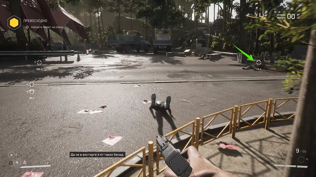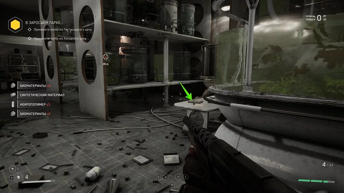 Сперва перебейте всех пчёл, затем зачистите локацию. В холле также разберитесь с несколькими волнами врагов и бегите за маркером. В лаборатории с нейрополимером осмотрите труп военного. Рядом лежит аудиозапись.