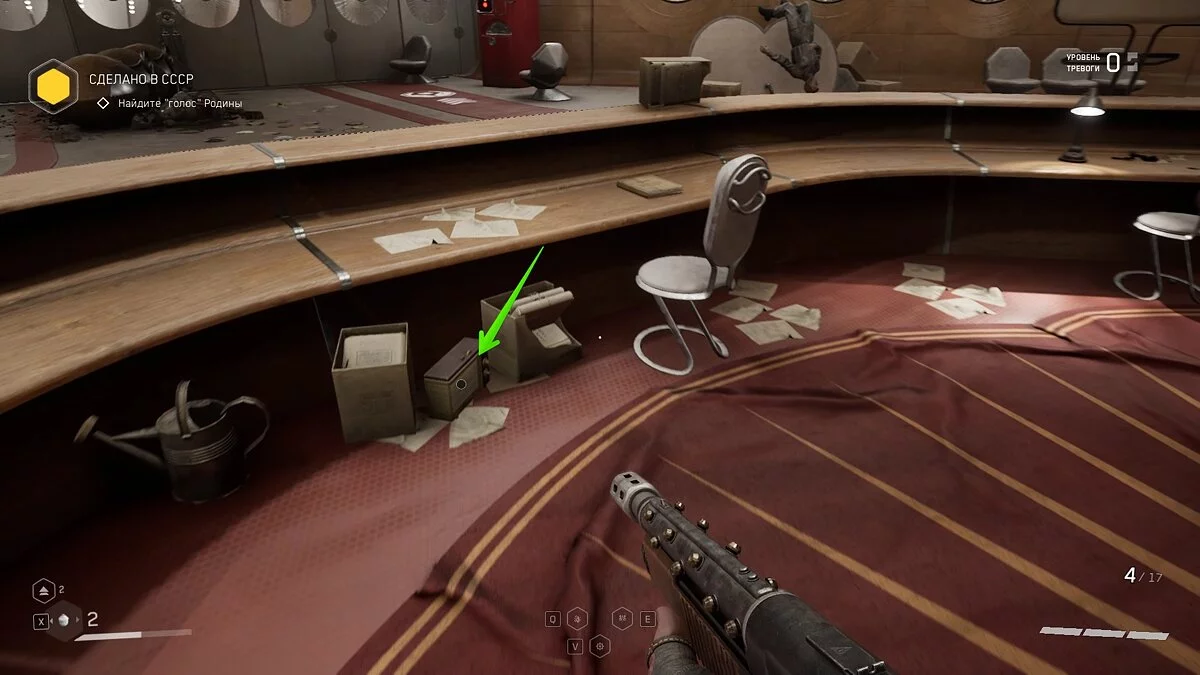 В этом помещении есть ещё две небольшие комнаты. Вам нужно найти молот, цветок и радиоприёмник. Молот и цветок находятся в этих комнатах, а приёмник — позади Терешковой. В помещении с цветком также лежит труп.