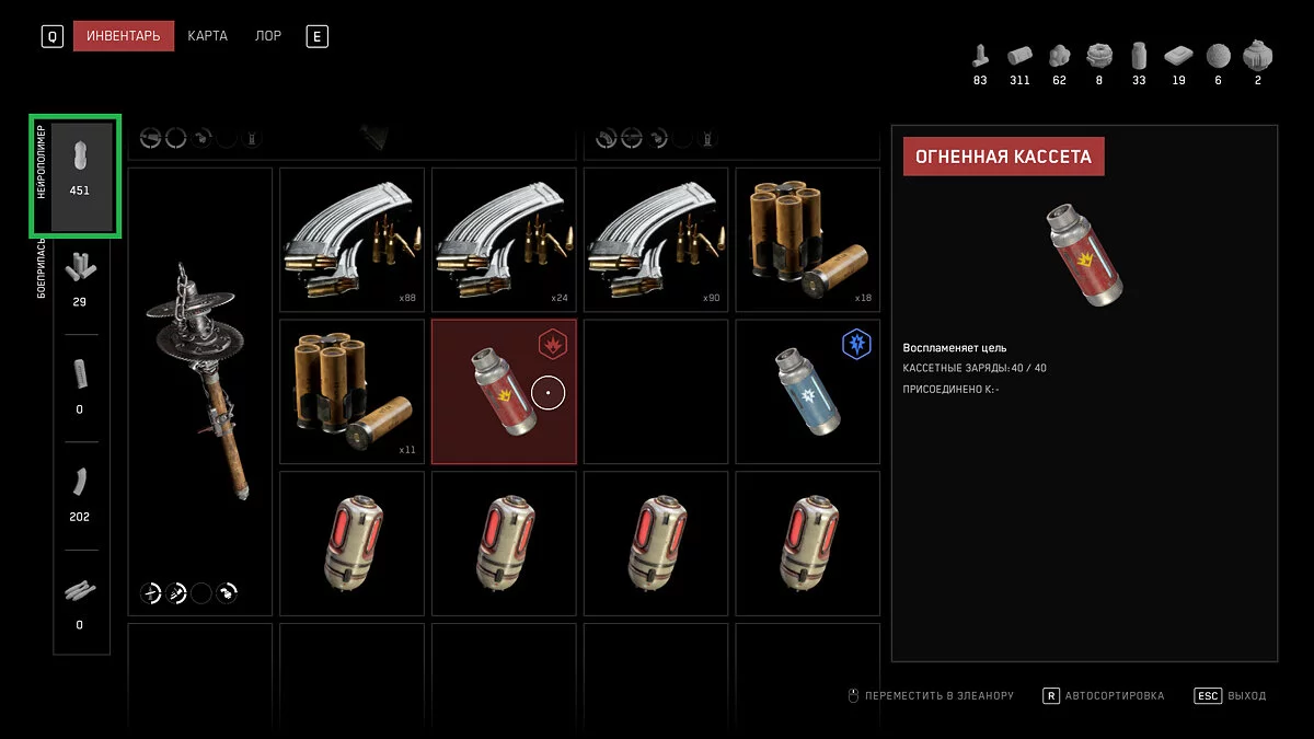 Единственная уступка, на которую пошли разработчики — различные материалы, необходимые для крафта, не занимают места и показываются в отдельном окне меню крафта и инвентаря. Боеприпасы занимают ячейки, но слева при открытии инвентаря можно увидеть их точное количество вместе с количеством нейрополимера.