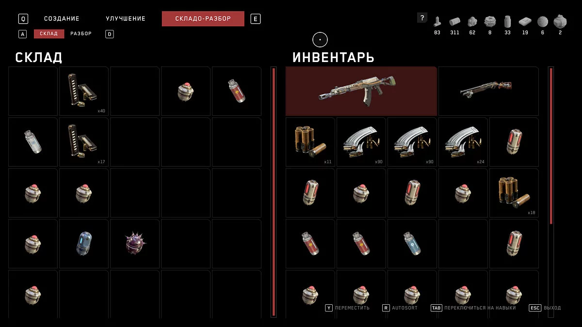 Для автосортировки нам и на складе, и в инвентаре доступна клавиша R (Y на геймпаде). С её помощью можно аккуратно разложить содержимое ячеек так, чтобы оно занимало наименьшее пространство. Если вы не хотите перетаскивать предметы мышкой, можно навестись на необходимый предмет и нажать Y (X).