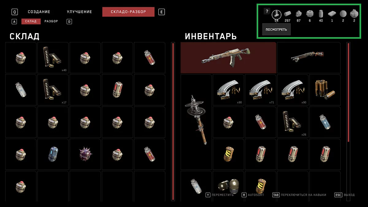 Доступ к складу мы можем получить через Элеонору, на вкладке «Складо-разбор». Здесь мы между вылазками будем сортировать собранное, подсчитывать необходимое количество патронов и капсул с непремом для крафта и разбирать ненужные расходники на ресурсы.