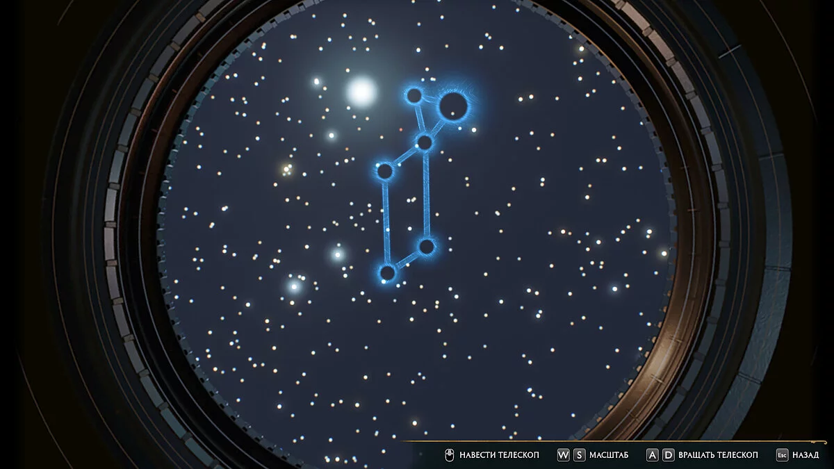 Смотреть на звёзды можно только ночью. Если вы пришли днём, то можете пропустить время в меню карты. Взглянув в телескоп, вы увидите синий силуэт. Это созвездие, которое нужно будет найти на заданном клочке неба. Сначала покрутите масштаб в одну и другую сторону, чтобы понимать размеры. В противном случае вы потратите много времени, пытаясь понять, где находятся нужные звёзды. После этого можете вращать телескоп. Если размер подобран правильно, то система поможет собрать картинку, когда вы будете близки к ответу.