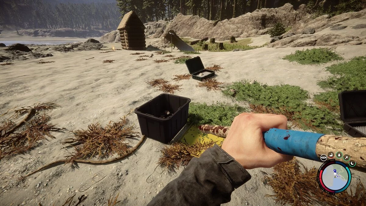 Сохранять прогресс можно только в импровизированных убежищах. Найденные пещеры не подойдут, по крайней мере, при отсутствии в них специальной мебели. Первым делом мы рекомендуем осмотреть ящики и контейнеры на побережье, которые остались после крушения вертолётов. На сложности «Нормально» и «Легко» вы найдёте в них брезент.