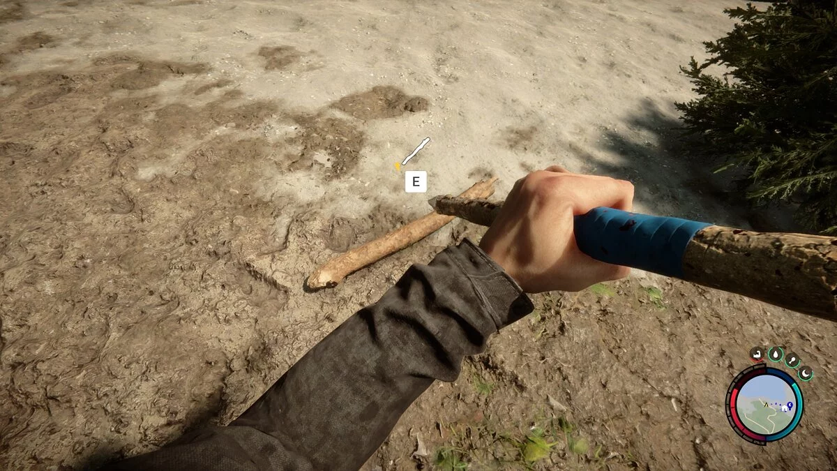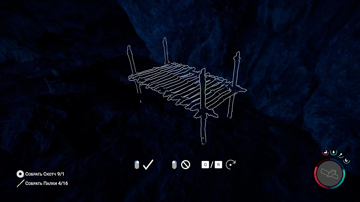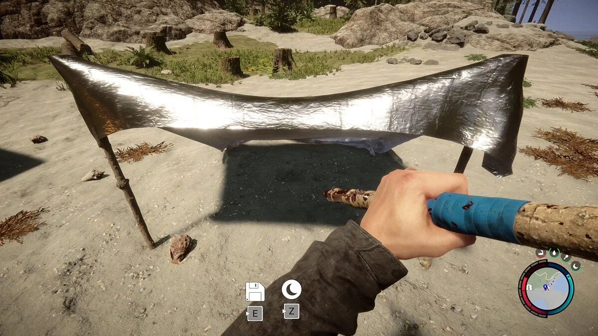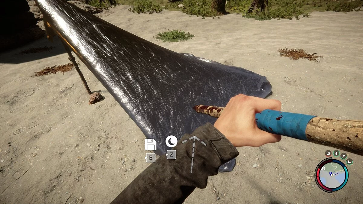 Подойдите к краям тяжелой ткани и нажмите на ЛКМ, чтобы установить две палки. Так вы получите своё первое примитивное убежище. Теперь вы можете отдохнуть и сохранить прогресс в любое время. Для этого подойдите к палатке и зажмите клавишу «E».