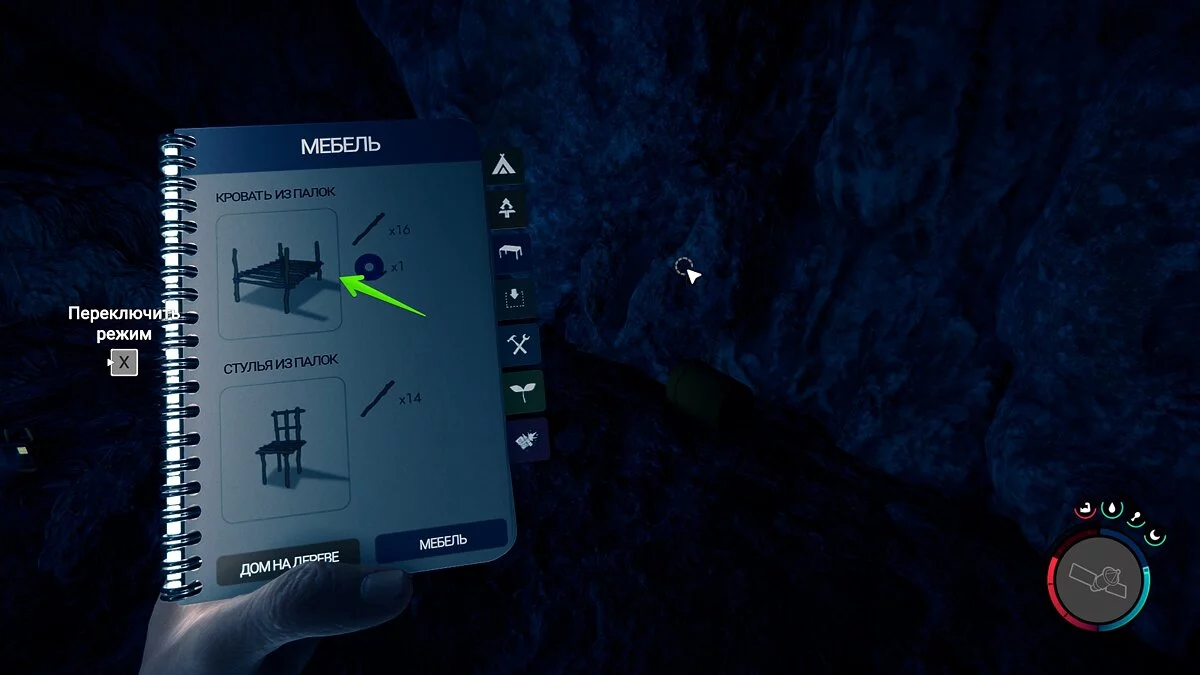 Если вам понадобилось сохранить свой прогресс при исследовании подземелий, воспользуйтесь обычной кроватью из палок. Вы можете найти рецепт мебели в меню крафта (клавиша «B»). Перейдите в раздел «Мебель» и выберите чертёж. Разместите его в любом удобном месте и соберите 16 палок. Помимо этого, также понадобится одна изолента. Её можно найти в пластмассовых контейнерах на побережье.
