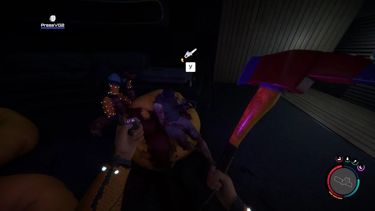 Удерживая кнопку ПКМ, вы сможете постоянно наносить урон противнику. Бензопила находится в трупе мужчины.