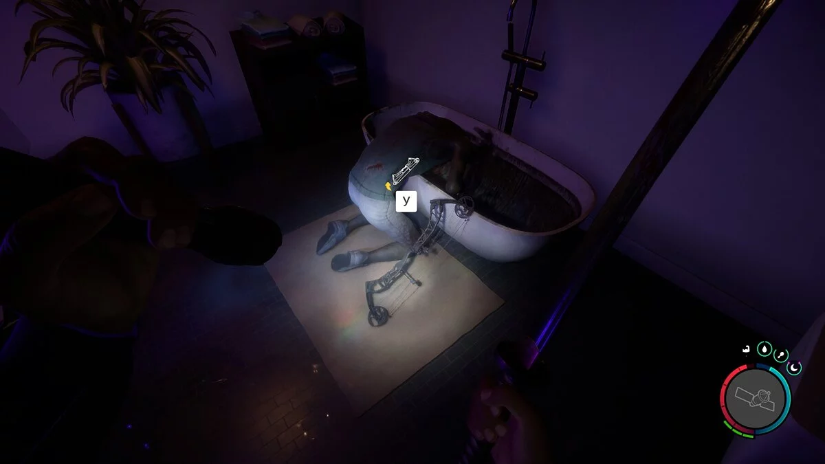 Спуститесь вниз и бегите по коридору вперёд. Зайдите в комнату справа и пройдите в ванную комнату. Справа от трупа лежит блочный лук. Здесь же вы можете обнаружить глушитель для пистолета и некоторые ценные припасы, например, смолу для 3D-принтера.