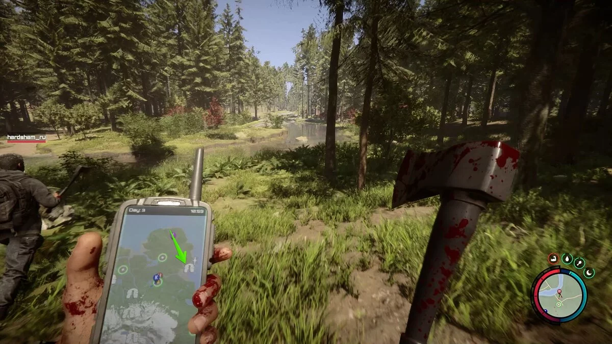 Между этими двумя локациями вы также можете наткнуться на лагерь, в котором есть припасы и труп. Здесь же вы найдёте современный топор.