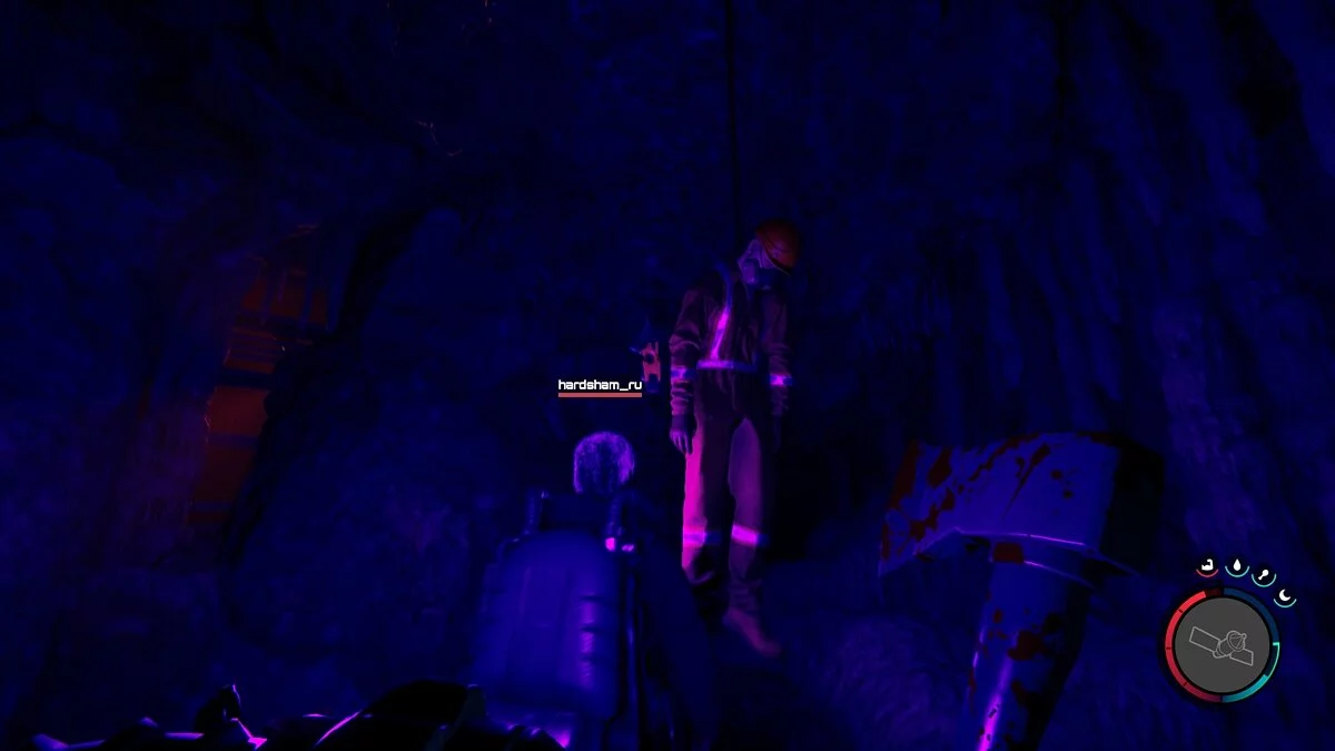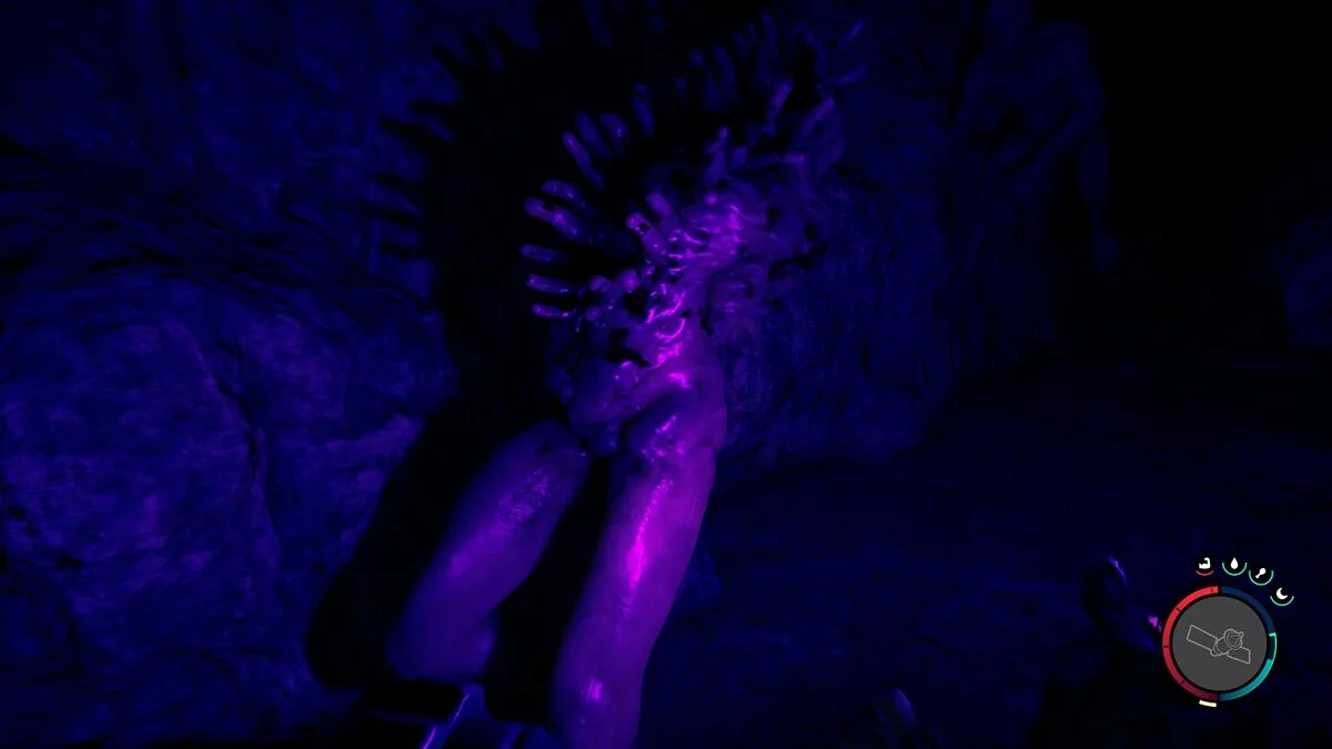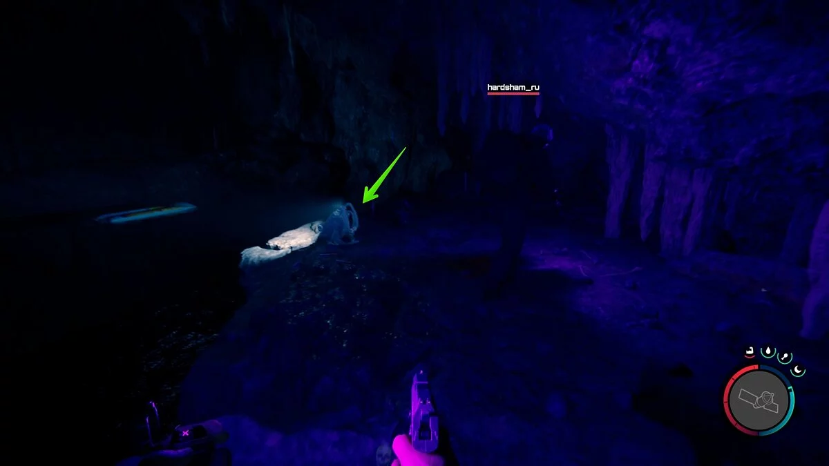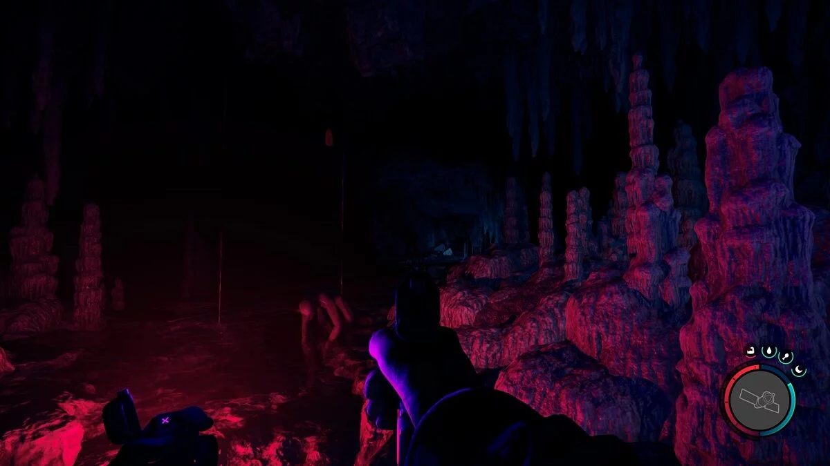 Мы рекомендуем вернуться обратно в пещеру и осмотреть вторую развилку, которая ведёт в правую часть подземелья. В тупике вы найдёте труп, подвешенный к потолку, у которого можно забрать шокер.