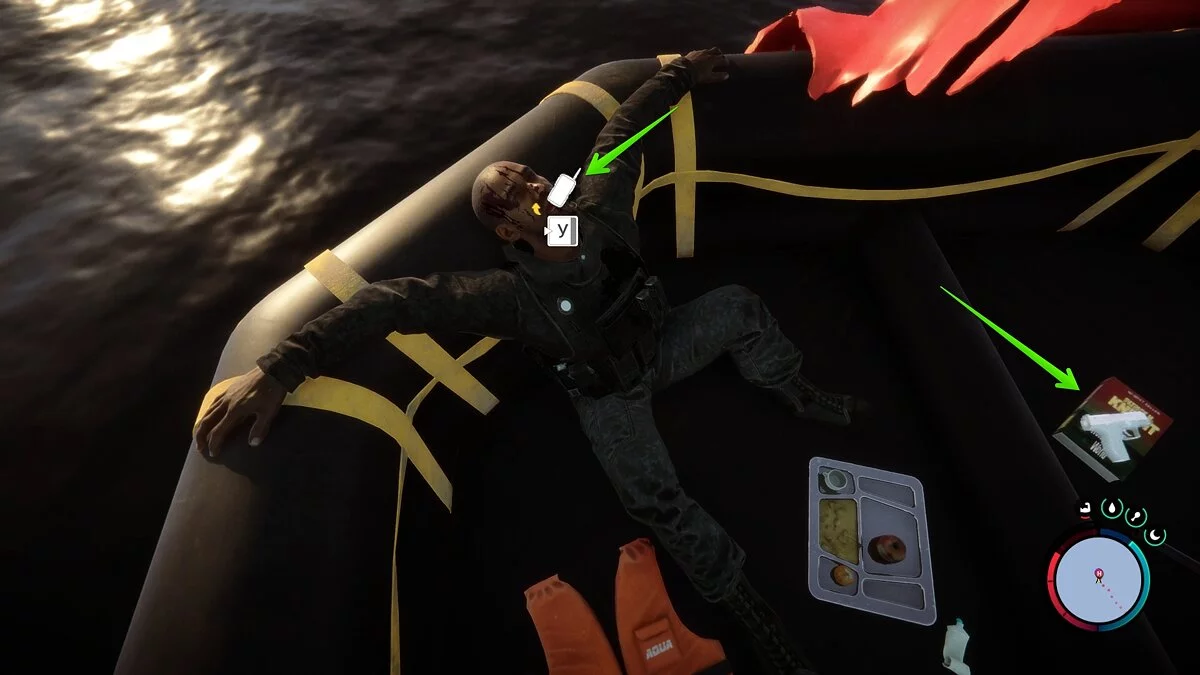 В лодке с одним из членов отряда вы найдёте рацию, некоторые припасы и пистолет. Не забудьте подобрать GPS-маячок.