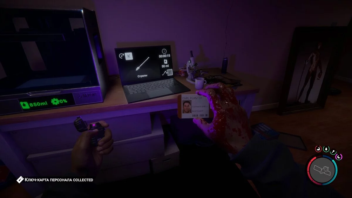 В этом же бункере вы найдёте стрелы для самодельного лука и сможете напечатать их на принтере. Помимо этого, вам встретится запертая дверь, для открытия которой необходима ключ-карта. Запомните это место и выбирайтесь. Следуйте за фиолетовым маркером.