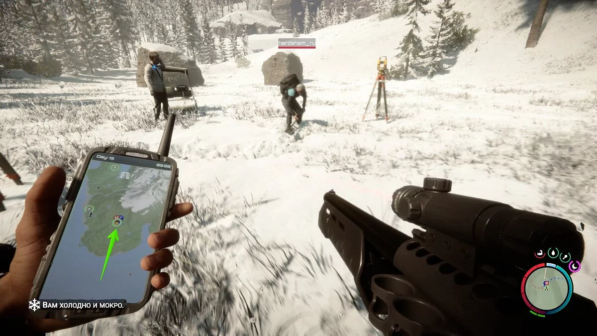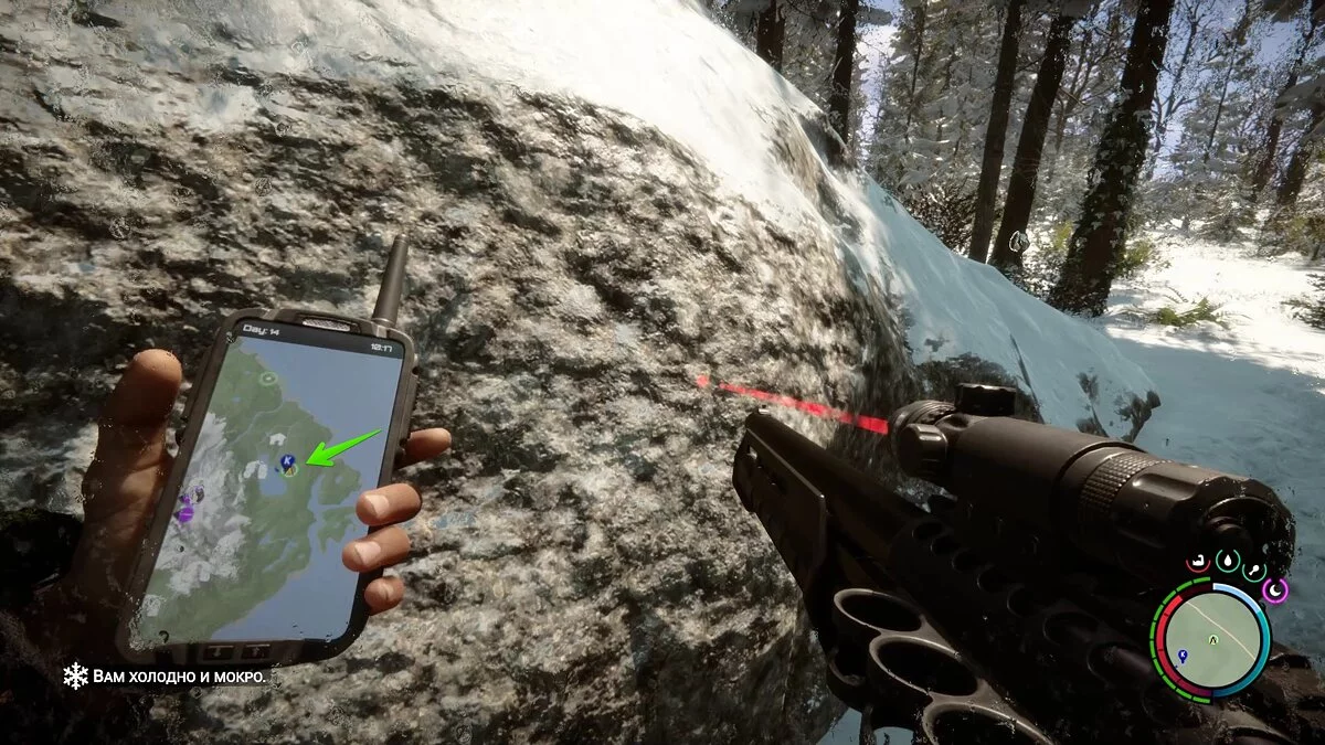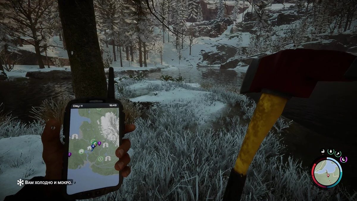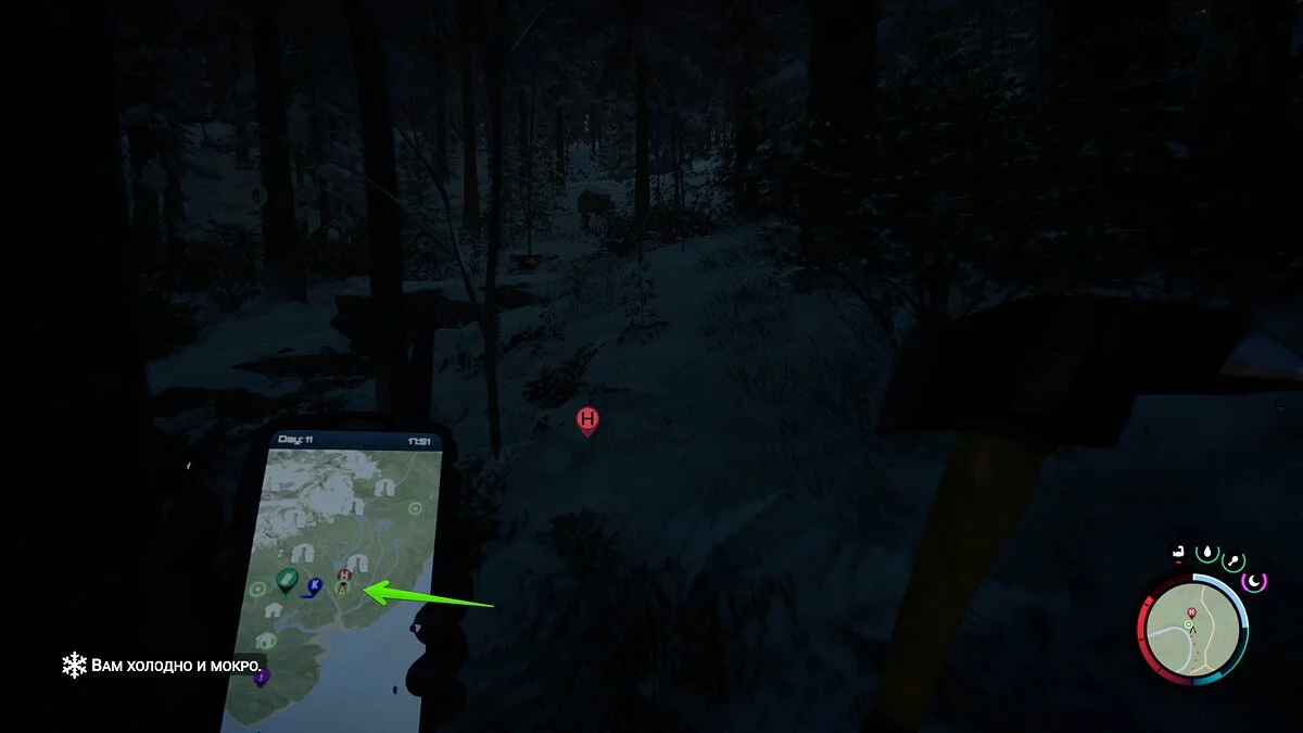 Когда вы выберетесь, скорее всего уже наступит зима. Она может наступить и раньше, всё зависит от того, как долго вы выживаете на острове. На карте останется посетить несколько точек интереса (зеленый маркер), но мы рекомендуем отправиться именно к той, которая указана на скриншоте ниже.