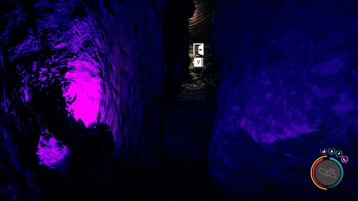 Войдите в пещеру и спуститесь в пролом. Здесь будет лестница, по которой также нужно спуститься. На нижнем этаже есть дверь. Если взаимодействовать с ней, то начнётся кат-сцена.