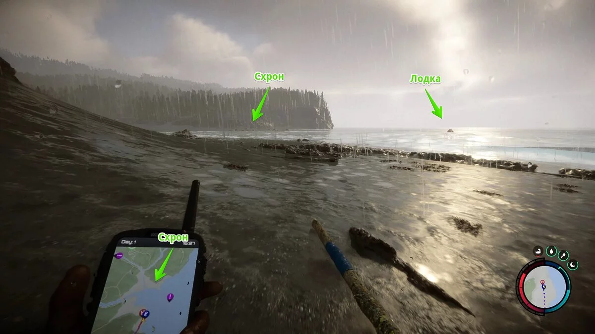 На берегу вы можете отыскать схрон с припасами и патронами. Он находится справа от местоположения лодки на карте.
