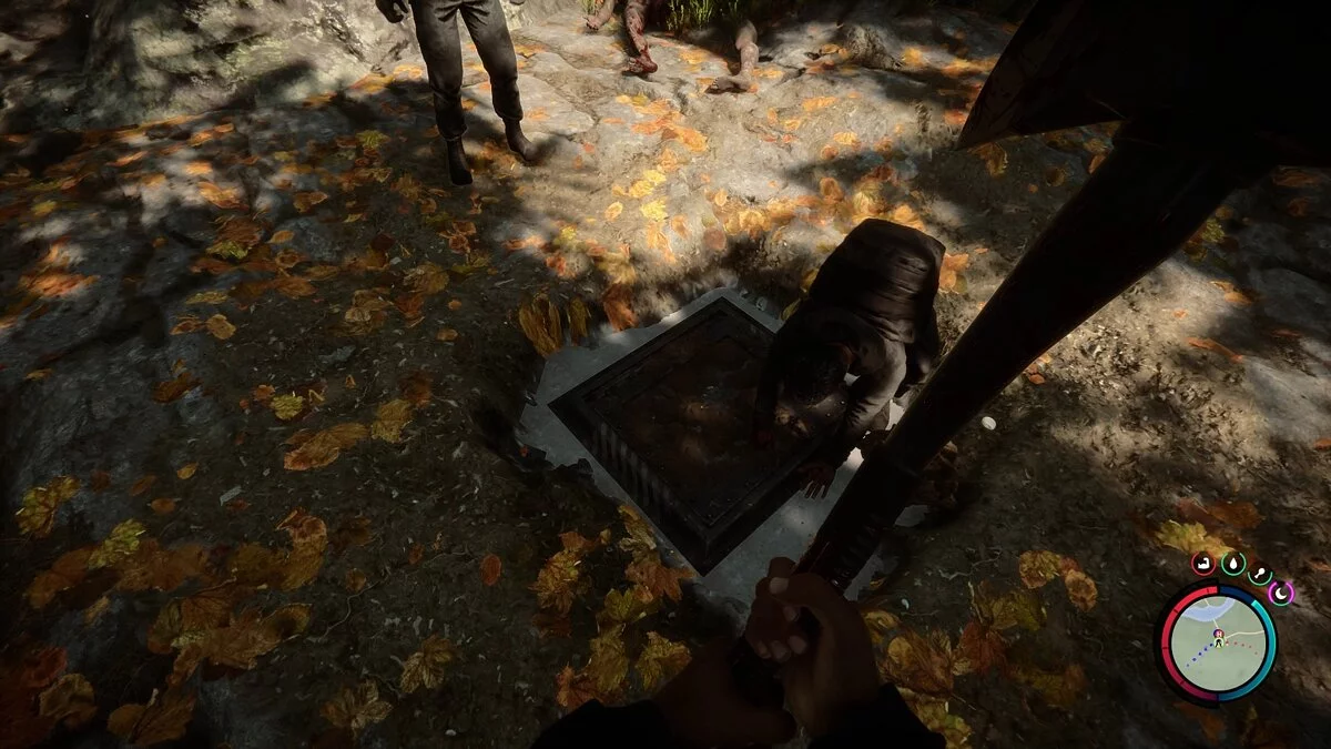 Выбравшись из пещеры, бегите на ближайшую точку интереса (зелёный маркер) и примените лопату. Здесь будет несколько гольфкаров, а также геодезическое оборудование. Копать нужно строго по центру. Так вы найдёте проход в бункер.