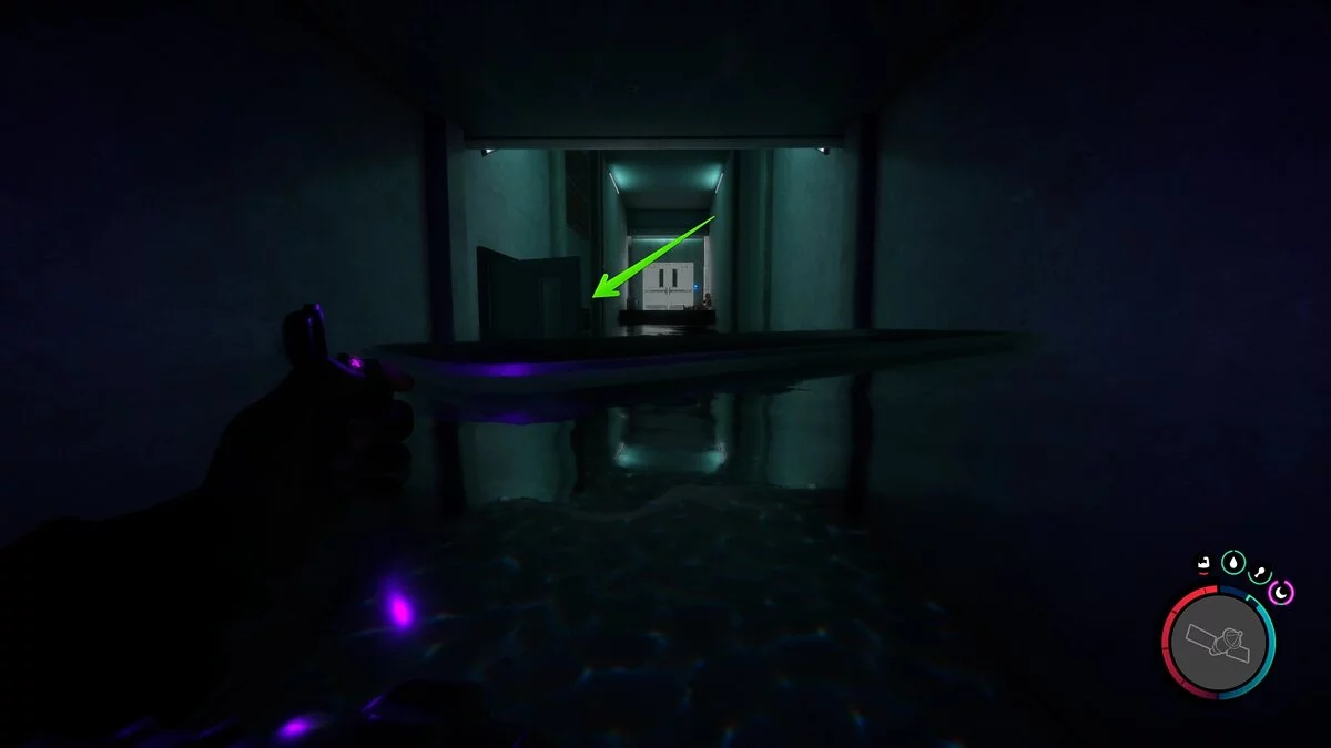 Здесь будет длинный коридор и несколько комнат, где выращивают зелень. В них же вы столкнётесь с парочкой монстров. Далее помещения будут затоплены, но надевать акваланг необязательно. Бегите вперёд, пока не доберётесь до развилки. В комнате слева будет несколько мониторов с видеозаписью, а также оранжевая ключ-карта на столе.