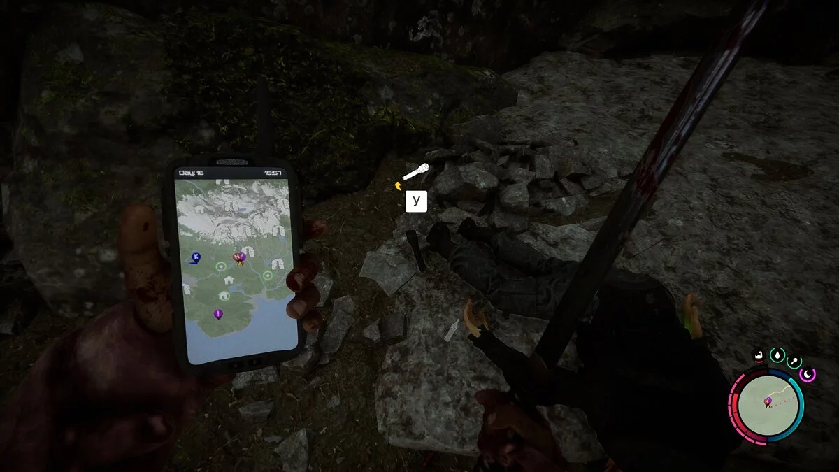 Отправляйтесь на маркер «Маячок 2» и осмотрите скалу. На вершине вы увидите труп, который связан верёвкой. Разрубите трос, чтобы тело свалилось вниз. Вместе с ним упадёт и фонарик. Стоит отметить, что фонарь может находиться не прямо на теле, поэтому рекомендуем осмотреть область в нескольких метрах от него.
