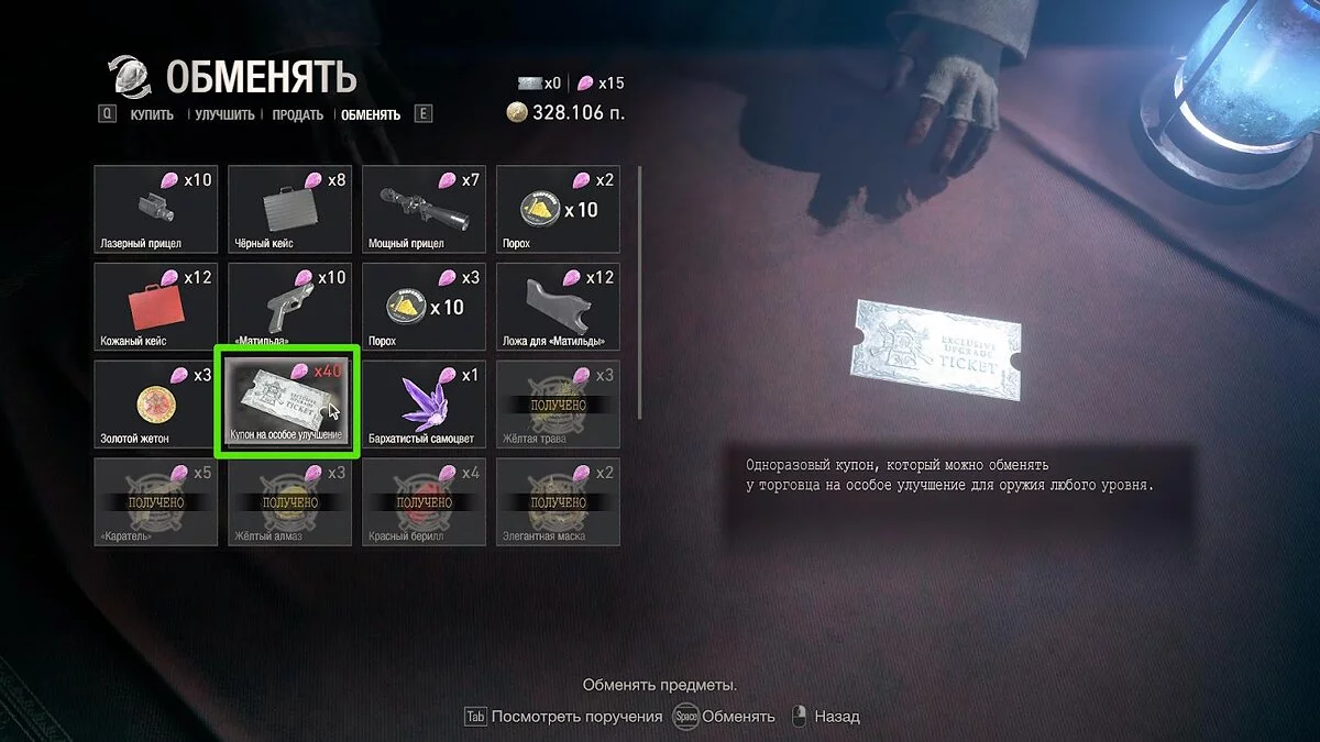 Вы можете улучшить мощность, боезапас, перезарядку и скорострельность каждого оружия. Сделать это можно у торговца, открыв соответствующий раздел. Кроме того, у отдельных пушек есть свой особый апгрейд, на который нужно будет потратить «Купон на особое улучшение». За одно прохождение можно купить всего 2 купона. После 7 главы у торговца вы можете обменять 30 шпинелей на один купон. Чуть позже у него обновится ассортимент, и следующий купон будет стоить уже 40 шпинелей.
