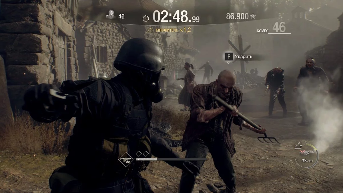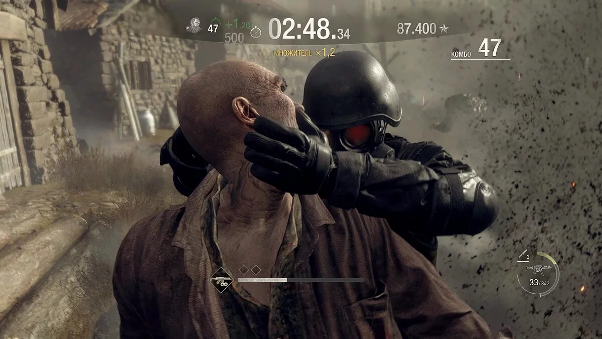 Теперь, когда вы осмотрели большую часть локации и собрали все шары, можно начинать сражение. Первым делом выйдите на площадь и активируйте способность героя. Убейте как можно больше врагов, старайтесь стрелять в голову. Когда расправитесь с 27 противниками, появится первый босс — тяжёлый враг с кувалдой. Разберитесь с ним и продолжайте уничтожать зомби, стараясь не сбрасывать комбо.