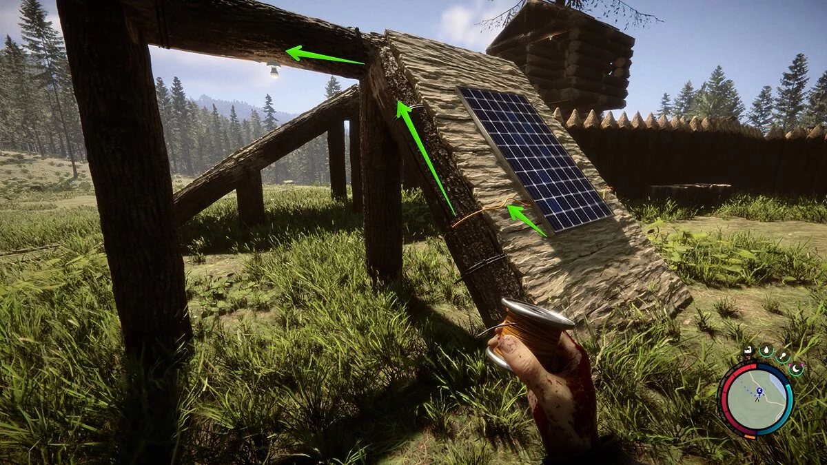 Как мы отметили ранее, лучше всего размещать подобные устройства на крышах ваших строений. Подобным способом вы сможете провести провода в любое место в вашем лагере и осветить его в тёмное время суток.