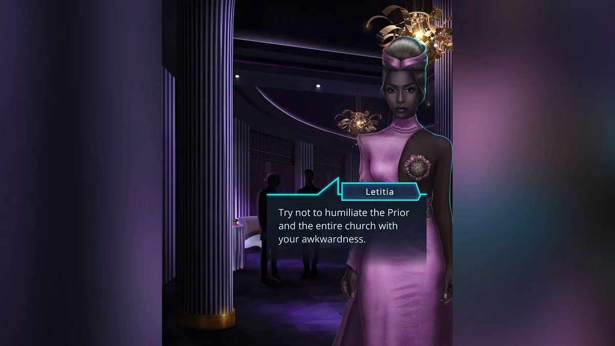 Вы не удержались на высоких каблуках, упали и задели стол с тарелками. Окружающие смотрели на вас насмешливо и пренебрежительно. Но Летиция заступилась за вашу героиню и упрекнула язвительную даму, которая не отличается верностью своему мужу. А советница заметила, что в комнате слишком скользкий пол.