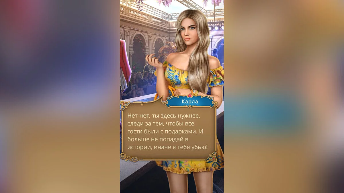 Ведем Карлу в гримерку, так как ей стало плохо. Возвращаемся в зал, где говорим с Синди про Палмейра: