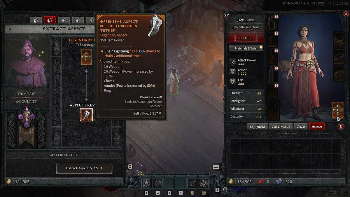 Например, у вас есть легендарный меч 30-го уровня с хорошим свойством, но вы его «переросли» и предмет вам больше не нужен. Извлеките аспект и используйте его с новым оружием. Или просто придержите усиление в инвентаре, чтобы использовать его, когда решите сменить билд.