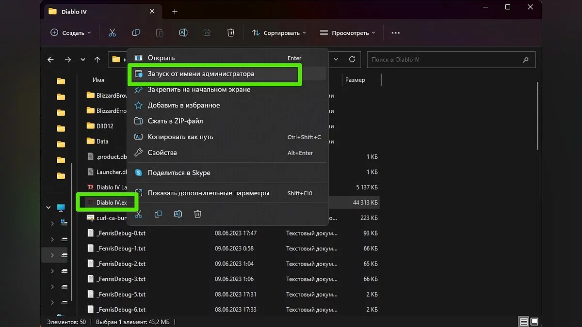 Нередко может помочь запуск игры от имени администратора. Для этого придётся открыть папку с игрой, нажать ПКМ на исполняемый файл Diablo IV.exe и выбрать «Запустить от имени администратора».