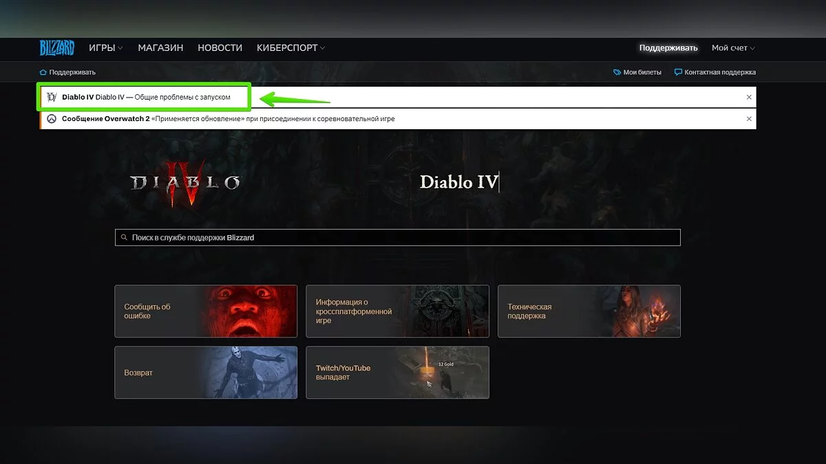 После 6 июня 2023 года игроки массово начали сталкиваться с проблемами при входе в игру. В основном они связаны с огромной нагрузкой на сервера Blizzard. Если вы не можете запустить Diablo 4, то наверняка разработчики уже знают об этом и пытаются решить проблему. Вы также можете отследить действия разработчиков прямо в лаунчере Battle.net. Для этого откройте лаунчер и отыщите сообщения на стартовой странице. Если неполадки действительно на стороне сервера, то вы увидите подобную надпись.