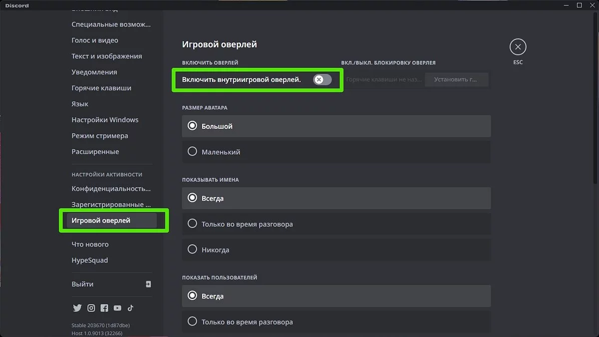 - Отключите функцию «Включить внутриигровое наложение»;