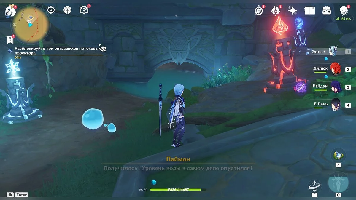 Следуйте за маркером и спуститесь вниз. У громкоговорителя вы встретите капельку, которую нужно будет сопроводить до старинного замка. По пути будут встречаться различные препятствия. Когда Гидро эйдолон будет попадать в лучи красного цвета, то окаменеет. Вам необходимо найти и передвинуть ящик, чтобы освободить его.
