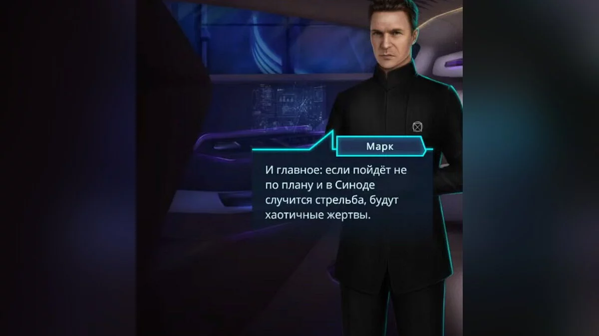 Викарий предложил Иво выйти. Инквизитор согласился. Жан-Франсуа предупредил о проблеме — некоторые советники не присутствуют на собрании. Они на празднике новоселья у Салих Норьега. Приор поручил Марку съездить и разобраться, а главе церкви порекомендовал двигаться в храм, чтобы встретить репортёров. Для безопасности к нему будет приставлен Ганс Гюлер. Вы постарались успокоиться и внушили себе, что этот переворот необходим для будушего человечества.