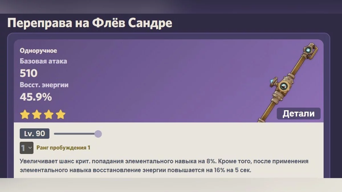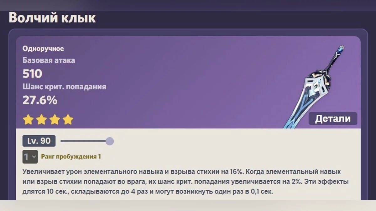 - Волчий клык (одноручный меч) — базовая атака 510, увеличивает урон от элементального навыка и взрыва стихии;