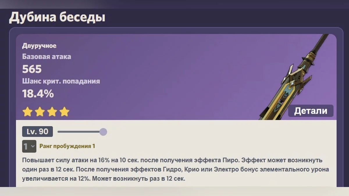 - Дубина беседы (двуручник) — базовая атака 565, повышает силу атаки после получения Пиро эффекта и урон от элементального навыка после Электро, Гидро или Крио эффекта;
