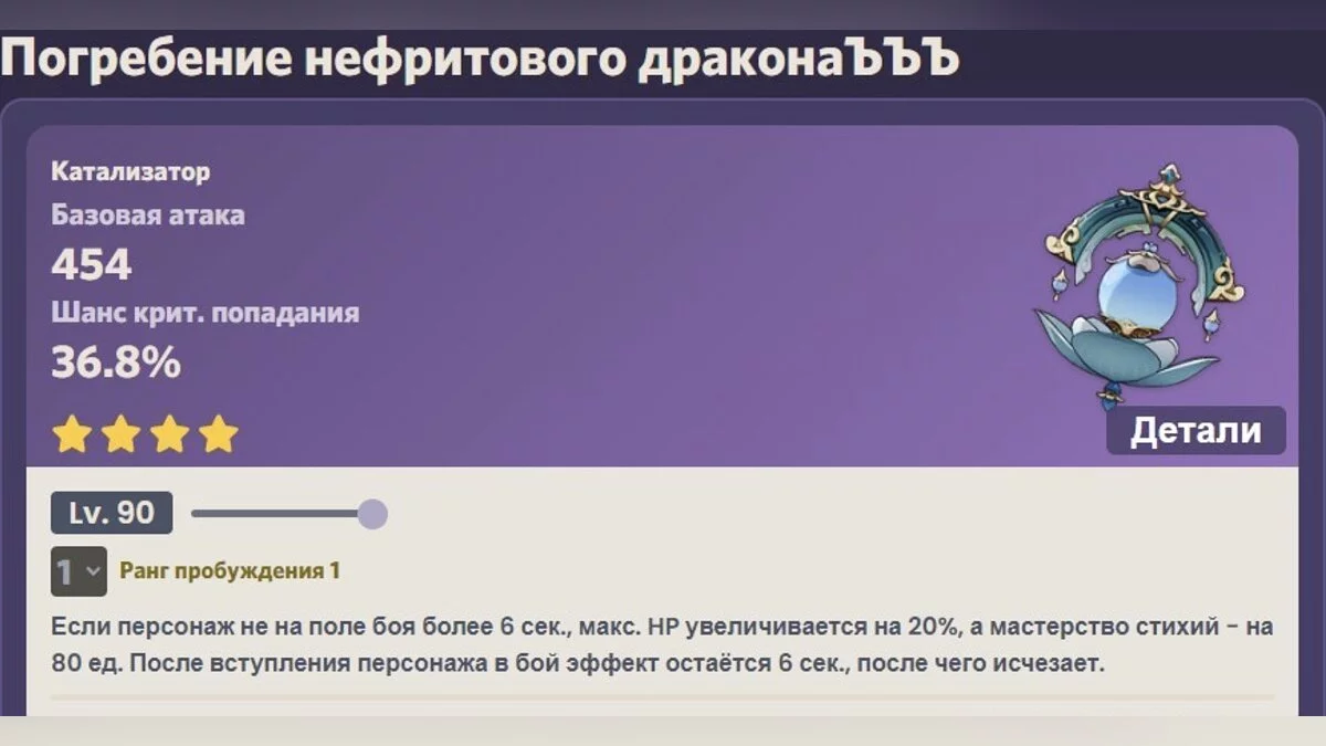 - Сверкание чистых вод (катализатор) — базовая атака 565, активация элементального навыка увеличивает урон от других стихий, а также дает Клятву жизни;