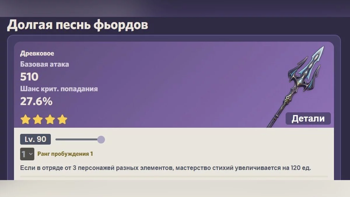 - Долгая песнь фьордов (копье) — базовая атака 510, если в отряде больше трех персонажей с разными стихиями, мастерство стихий увеличивается.