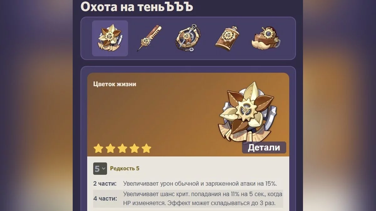 - 4 части сета — повышает шанс критического урона на 11% на 5 секунд за изменение здоровья носителя.