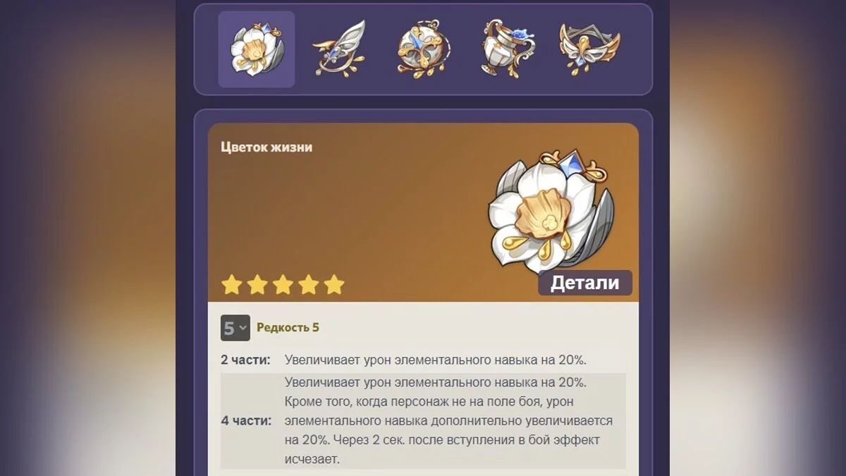 - 4 части сета — пока персонаж не на поле боя, урон от элементального навыка дополнительно увеличивается еще больше.
