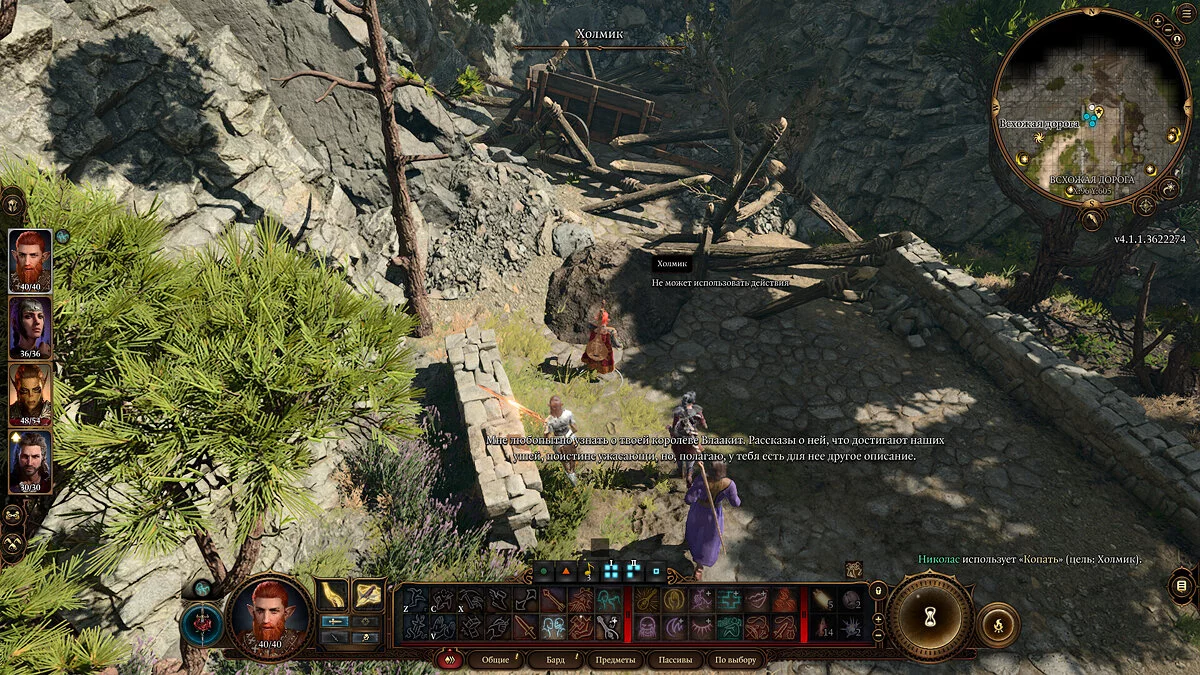 Иногда при исследовании Фаэруна вы будете внезапно делать бросок на восприятие. В случае успеха перед отрядом появится небольшой курган. При взаимодействии с ним без лопаты вы увидите сообщение «Не может использовать действие».