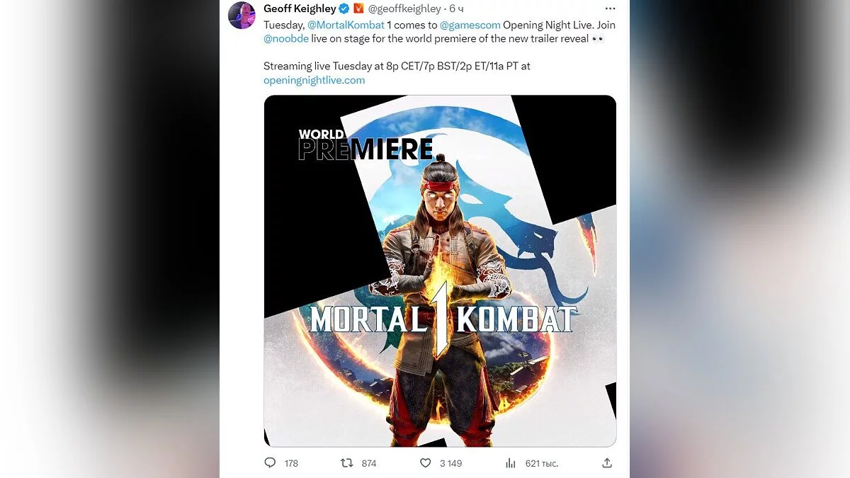 Пока неизвестно, что нас ждёт, но на скриншоте с превью можно заметить надпись «Мировая премьера». Возможно, это демонстрация новых персонажей или подробности о сюжете. Mortal Kombat 1 выйдет 19 сентября на PC, PS5, Xbox Series X/S и Nintendo Switch.
