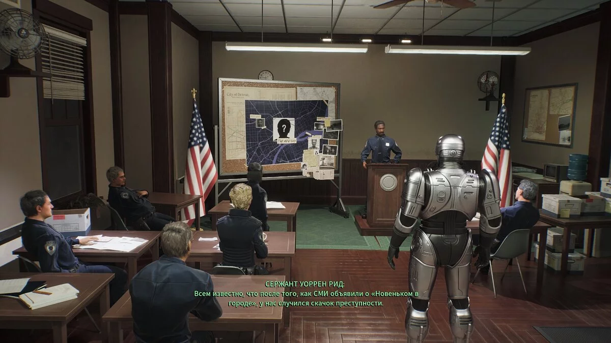 Сразу хочется похвалить внимание создателей к деталям. Несмотря на скромный бюджет, все знаковые места воссозданы с фотографической точностью. Особенно фанатов порадует полицейский участок, который буквально такой же, как и в фильмах. Не забывают и про менее очевидные отсылки. Например, полицейские машины, выезжая со стоянки участка, всегда цепляют задним бампером асфальт (так было и в кино), Робокоп не может посетить некоторые места без ордера, говорит те самые фразы и никогда не достаёт оружие первым.
