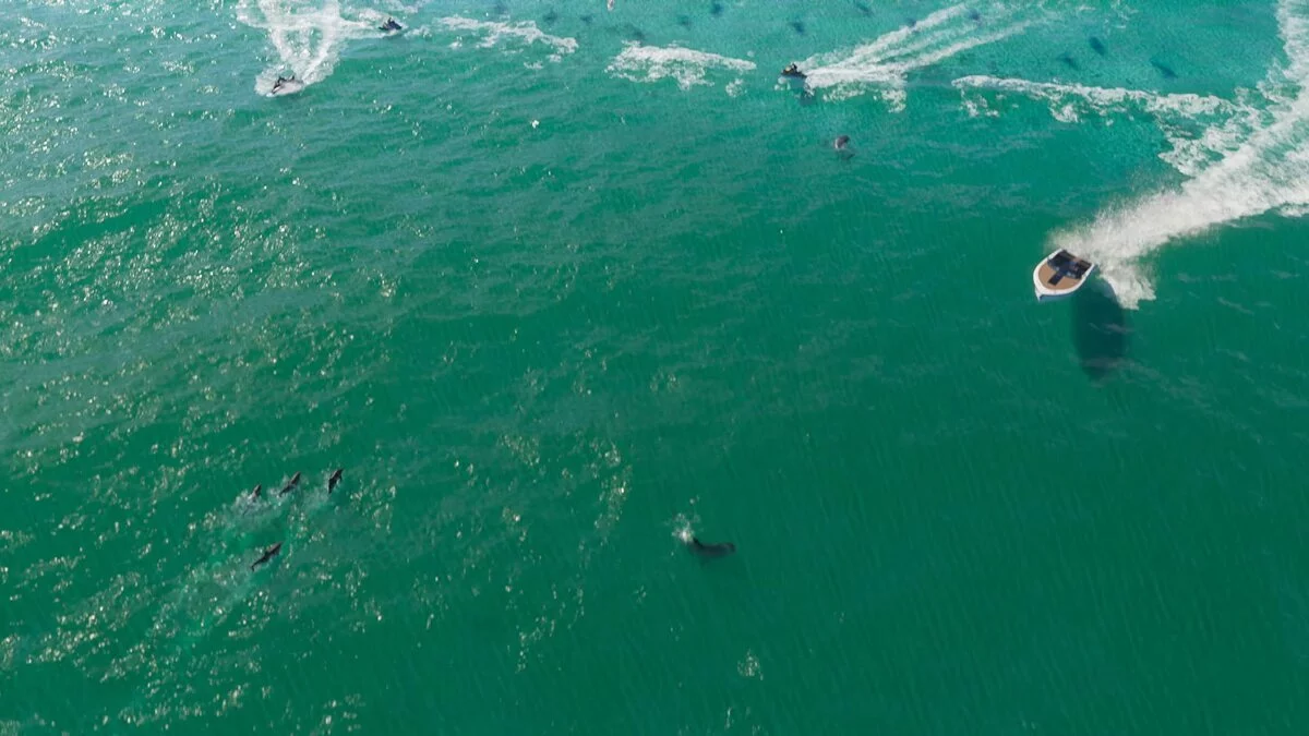В трейлере много внимания уделено водной поверхности. На кадре ниже можно заметить дельфинов.