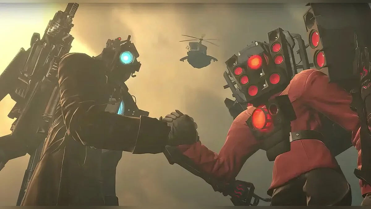 Эпический бой между двумя гигантскими камераменами. Контроль над одним из них захватил скибидист. По ходу сражения гибнут десятки случайных персонажей, а после освобождения союзника звучит грустная музыка, и выжившие скорбят по убитым. В столь безумном произведении эта сцена выглядит, по меньшей мере, странно.