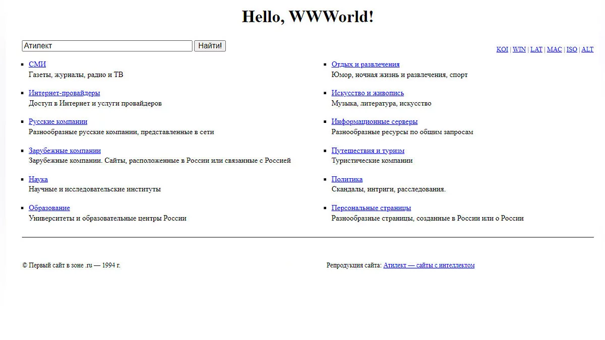 Первые попытки наладить интернет-связь в нашей стране предпринимались за много лет до появления конкретных сайтов. 1 августа 1990 года была запущена компьютерная сеть «Релком», которая объединяла десятки научных организаций по всему СССР с целью оперативной передачи информации. В 1991-м освоили формат телеконференций и появилась возможность отправки сообщений по электронной почте. 19 сентября 1991 года была утверждена доменная зона .su, к которой относились все интернет-ресурсы Советского Союза. В 1993 году появился первый российский интернет-провайдер «Демос Он-Лайн». Именно его сотрудники создали сайт, о котором мы расскажем ниже.