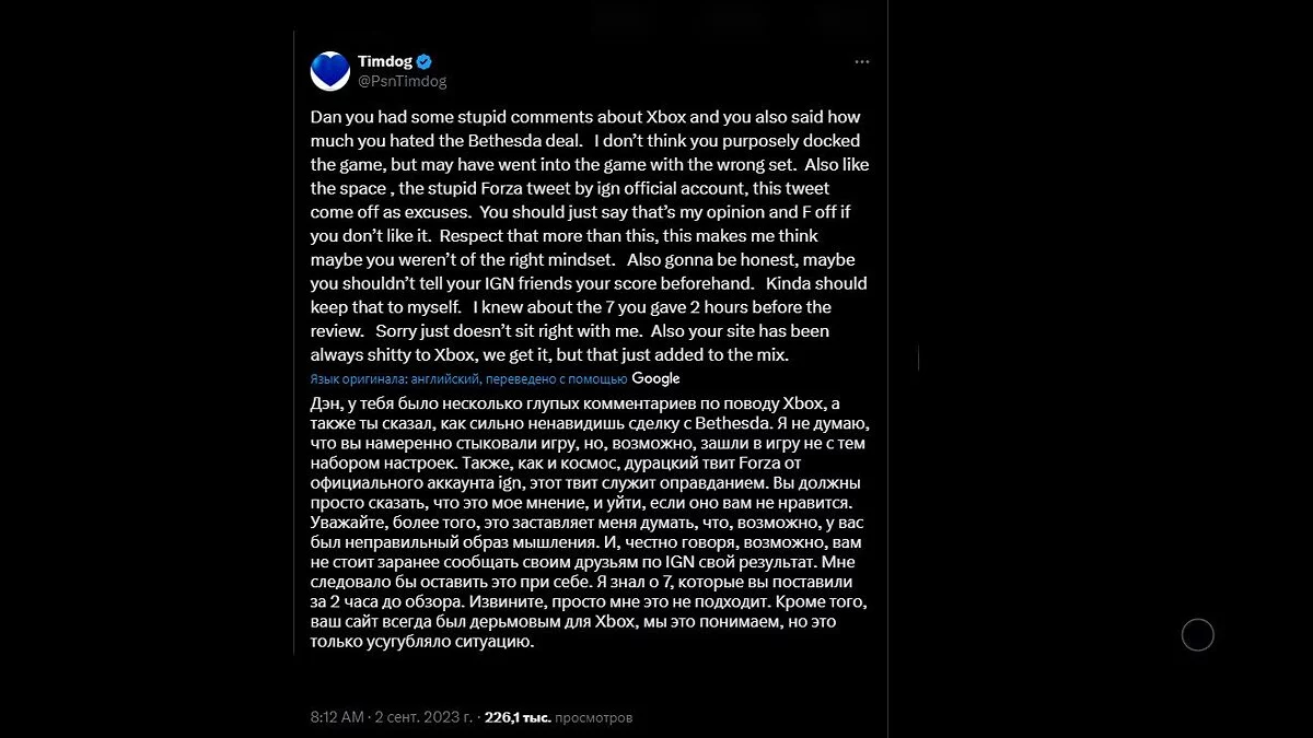 Не стоит забывать о консольных войнах, которые негативно отражаются на репутации СМИ. Автор Дэн Стэплтон (Dan Stapleton) из IGN в социальных сетях неоднократно признавался в любви PlayStation и в открытую ненавидел Xbox. Именно ему выпала задача сделать обзор Starfield. Конечно же, никто из читателей не принял итоговую оценку, так как, по их мнению, ненавидящий всем сердцем определенную платформу автор не может объективно оценить медиапродукт от данного платформадержателя. И подобных Дэну журналистов очень много. Например, бывший автор IGN и соучредитель Kinda Funny Грег Миллер (Greg Miller) неоднократно открыто признавался в любви PlayStation и крайне негативно высказывался в адрес других платформ. Он обожает спорить с читателями и всеми способами «вдалбливать» свою точку зрения.