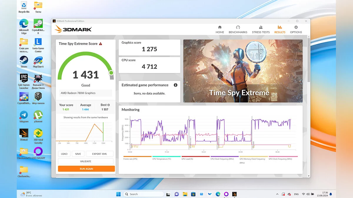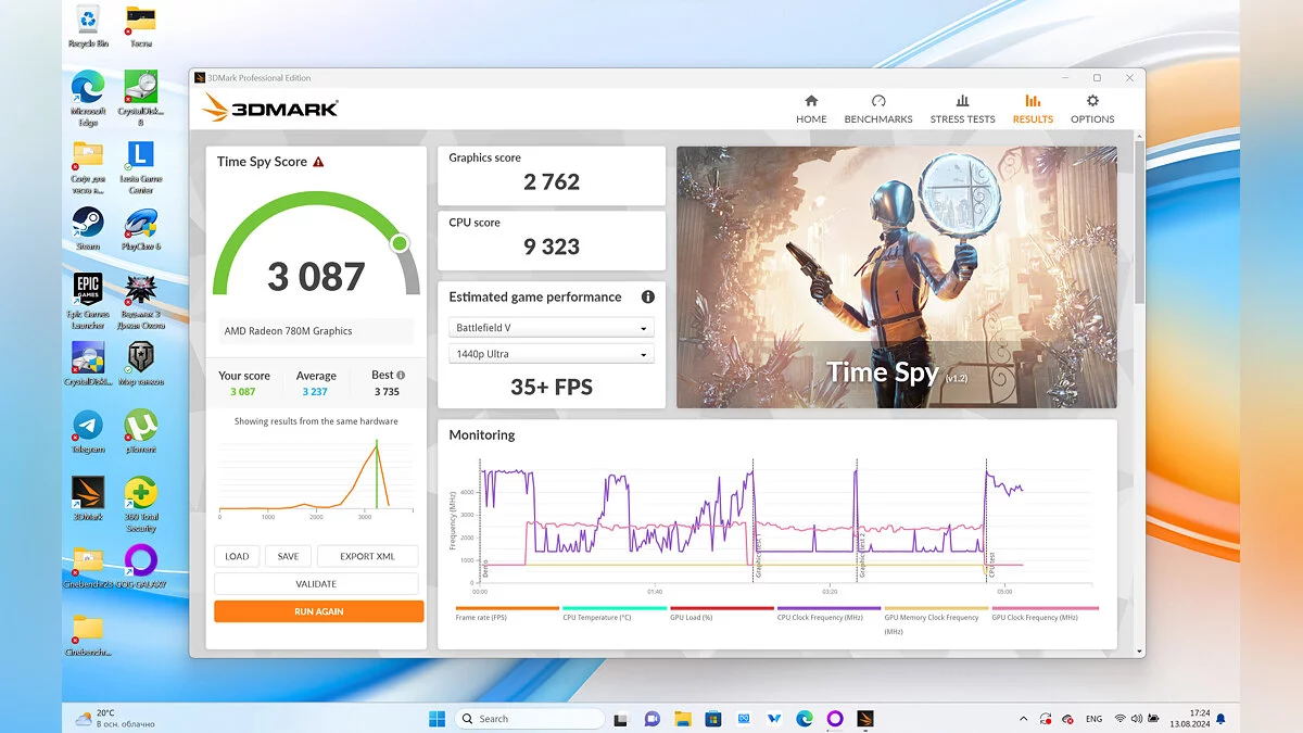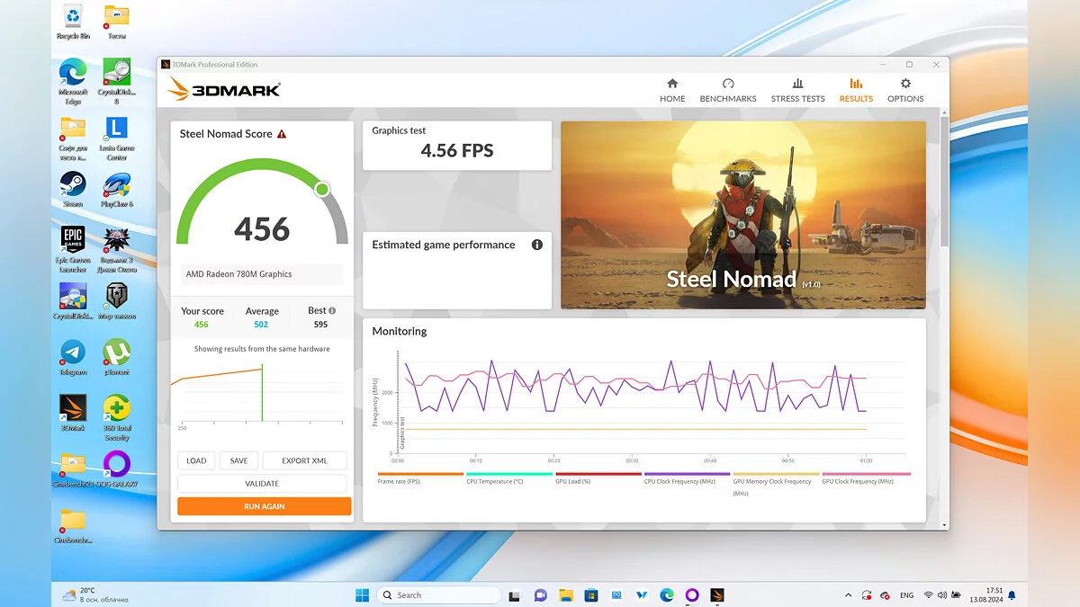 За графику отвечает AMD Radeon 780M с 12 исполнительными блоками на архитектуре RDNA 3.0 — это одно из наиболее производительных решений среди GPU-ядер в CPU. В качестве видеопамяти используется оперативка.